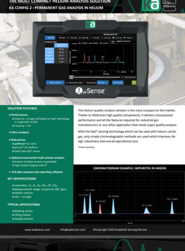 Our helium quality analysis solution is the most compact on the market. ASDevices solution features high quality components and delivers unsurpassed performance with all the features required for industrial gas manufacturers or any other application needing helium quality analysis. Improve robustness and reduce overall operational costs thanks to our proprietary enhanced plasma discharge (Epd) sensing technology, that can be used with helium carrier gas, and our simple chromatographic process.