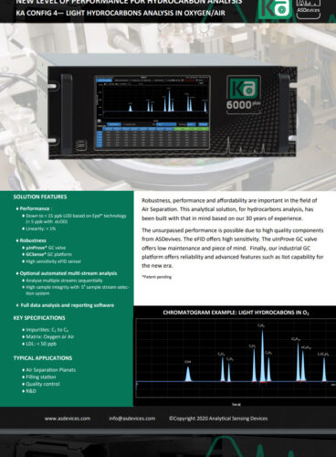 Our hydrocarbons analytical solution has been built keeping in mind that robustness, performance and affordability are important in the field of Air Separation. Get peace of mind and achieve unsurpassed performance with ASDevices high quality components: a highly sensitive eFID detector, a low maintenance leak proof GC valve and a reliable industrial GC platform offering advanced features such as IIot capability.