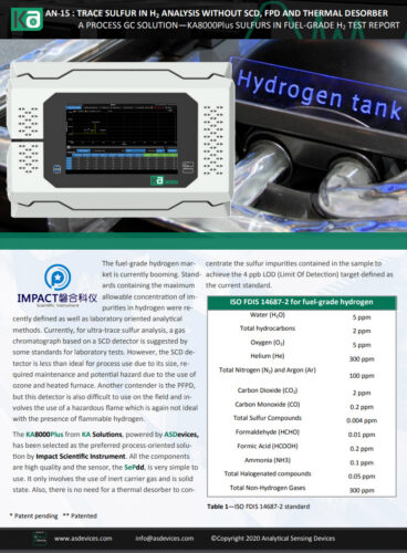 Find out about the test report for our trace sulfur in hydrogen analysis solution. Our devices are without SCD or FPD detector and do not need a thermal desorber to concentrate the sulfur impurities contained in the sample to achieve the current target standard of 4 ppb LOD (Limit Of Detection). Our solution is made with high-quality components and our simple to use SePdd sensor, only involves inert carrier gas usage and is solid state.
