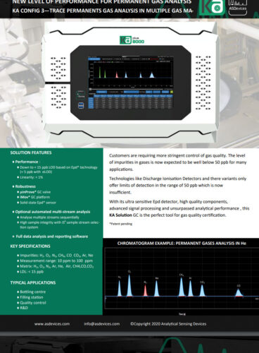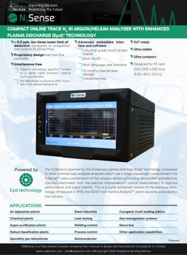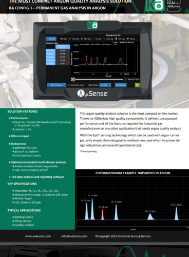 Our argon quality analysis solution is the most compact on the market. Thanks to ASDevices high quality components, it delivers unsurpassed performance and all the features required for industrial gas manufacturers or any other application that needs argon quality analysis. Our proprietary enhanced plasma discharge (Epd) sensing technology, that can be used with argon carrier gas, combined with our simple chromatographic process, improves robustness and reduce overall operational cost.