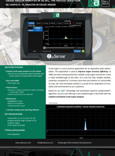 Crude argon is a very common application for air separation plant optimization. Get the simplest and fasted crude argon analyzer in the world, thanks to ASDevices exclusive enhanced plasma discharge (Epd) detectortechnology and proprietary spectral compensation algorithm technology. Achieve a 30 second analysis cycle with our very simple chromatographic method that uses only one valve, one column and no O2 trap. With our parallel chromatographic channel, the cycle time can be as short as 15 seconds.
