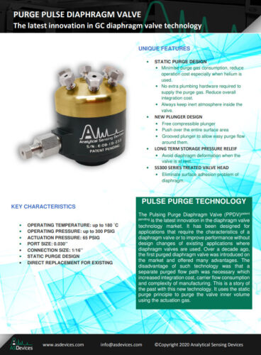 The PLSV valve technology is compared against an AFP ELDV-2 Diaphragm valve for the measurement of VOCs using a gas chromatograph/Mass-Spectrometer instrument. The third-party test demonstrates the benefits of the purge lip sealing valve (PLSV) technology against the diaphragm valve for pressure drop and dead volume performance.