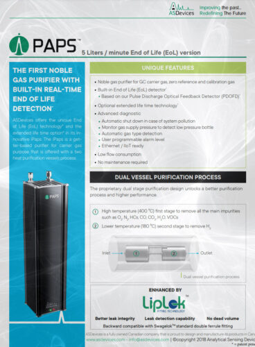Simplify your chromatography and improve limit of detection (below 1 ppb) for permanent gases in various matrix with a new measurement method using the ASDevices’ pre-concentration system based on our Trap & Release Purge Lip Sealing Valve. Get improved reliability, faster analysis time and hardware cost savings with our proprietary nanostructured trapping materials and unique valve matrix venting feature allowing most of the matrix to be easily eliminated without using a heartcut or backflush.